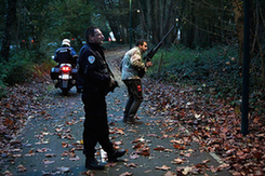 11月7日,来自澳门的戏剧表演者在乌镇西栅古街上表演话剧《Preserving Happiness》。围观游客大多第一次如此近距离观看戏剧表